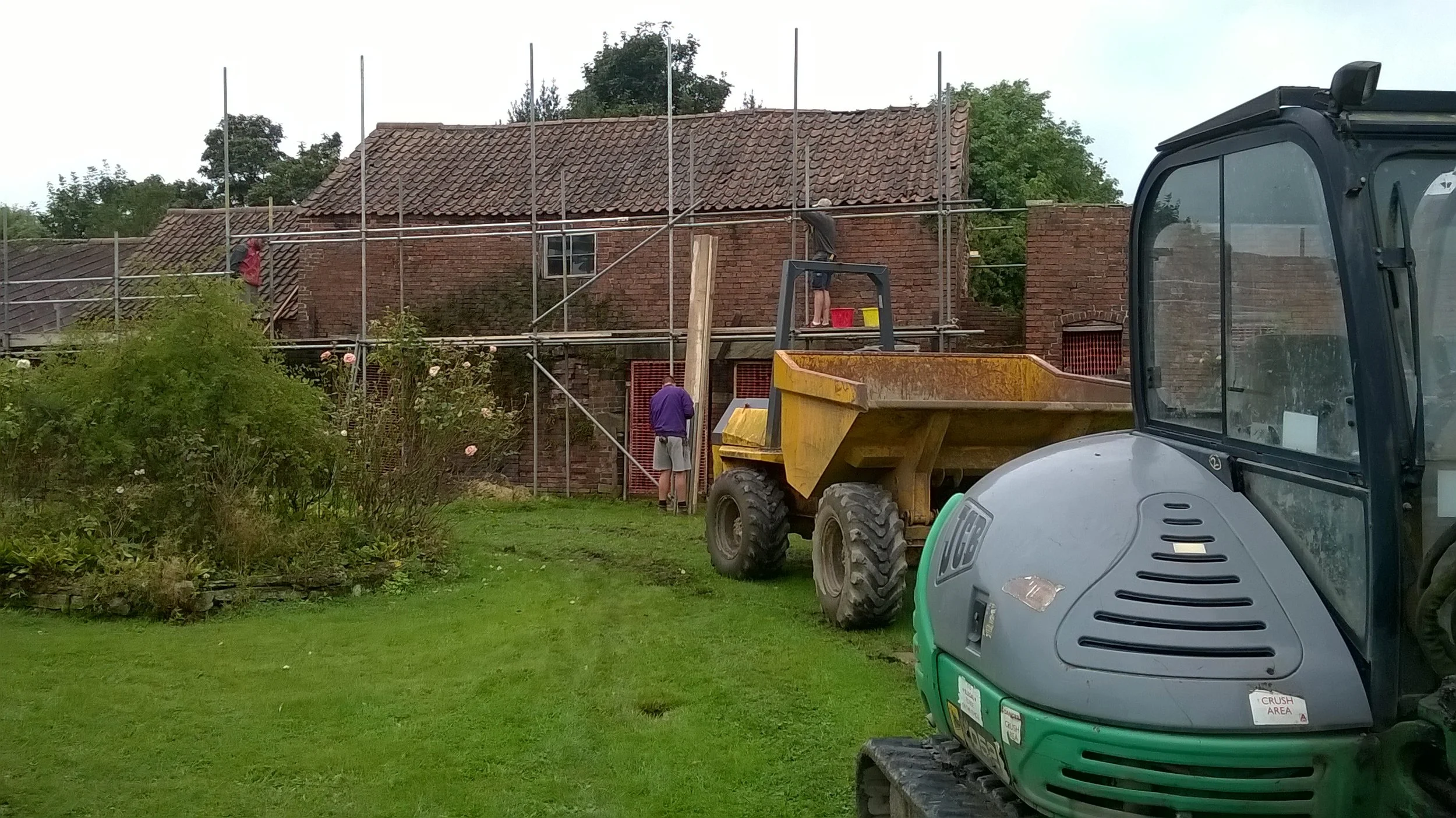Dan the digger (and dog) and Frank have now been joined by a couple of lads taking down the roof on plot 1, carefully removing the dangerous walls and cleaning up the bricks ready to re-use. How exciting.........some actual work on the barns. After waiting so long for something to start happening, it really is underway at last.