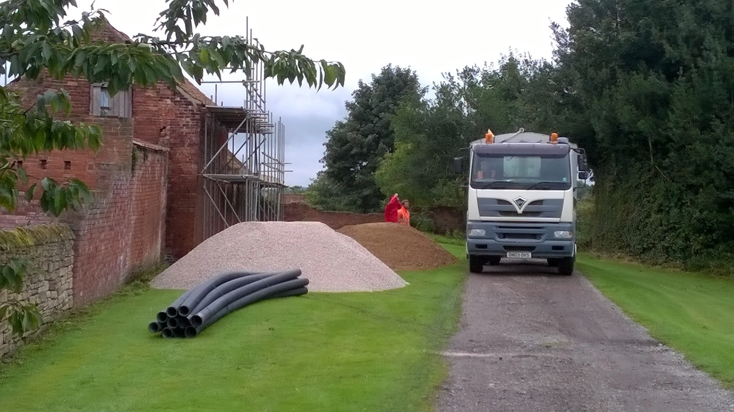/Work on the lane is underway and close to being finished. It has seemed very slow progress but there has been a lot more to it than I imagined - so, no surprises there then! The lane is about 300m long and it has a gentle climb to to the top of the hill. The method of attack has been to dig a channel at least 2 feet deep a pipe length at a time with the sewer piper laid in it in a bed of gravel, along with a conduit pipe for Open Reach broadband cable. Along the first section of the lane were some extra hazards including power cables, an unmarked sewer and water mains pipe. At every (slight) bend in the road a man hole has been installed as well as a silt trap. Hopefully when its all finished the road won't wash away and flood at the bottom the next time it rains. About half way up a 20m section of sandstone was encountered so that slowed progress as it had to hammered out by a different digger. A couple of days ago the pipe reached the top of the lane - whoo hoo! Since then, the lane surface and passing places have been scraped ready for the top layer of stone (approx 80 tons) to be laid and rolled flat. It will be like a proper lane rather than a dangerous and muddy track (hopefully).